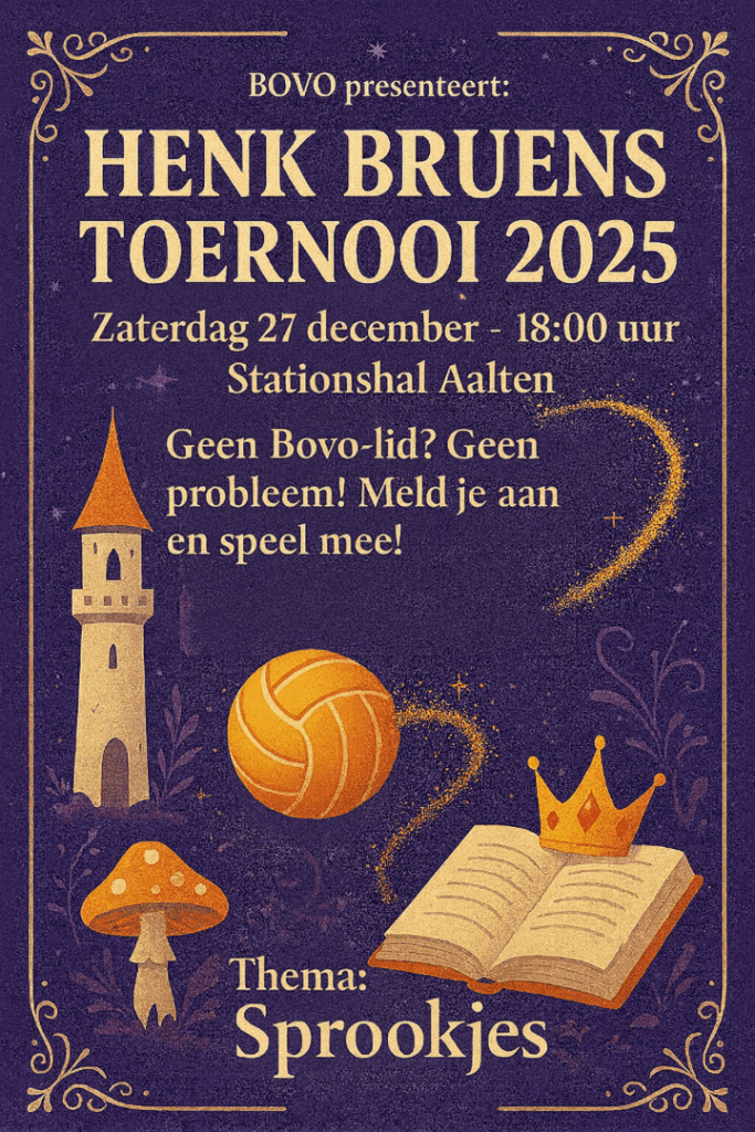 Op zaterdag 27 december 2025 verzamelt het rijk zich in de Stationshal Aalten voor het meest betoverende volleybaltoernooi van het jaar: het Henk Bruens Sprookjes Volleybaltoernooi!